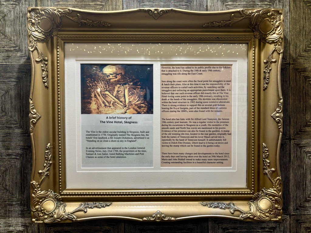 This stretch of coast was rife with smuggling well into the eighteenth century. The hotel displays information about the legend (below, pictured 2024). There is no tangible evidence that the man was an excise officer, and no buttons exist. Even the whereabouts of the skeleton is unknown. However, in the late nineteenth century, many skeletons were found bricked into buildings in the nearby (and then much bigger) market town of Alford, which was known to be a centre of smuggling. The About Alford blog is fascinating on this subject.