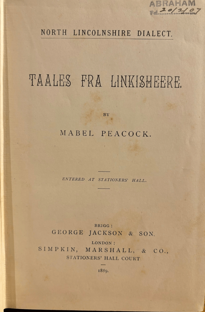 Peacock’s Tales & Rhymes in the North Lindsey Folk-speech (Brigg, 1886) contains three retellings of known folktales; herTaales Fra’ Linkisheere (Brigg, 1889) has one retelling and eight of Aesop’s more famous Fables. Both books are entirely in local dialect, and, taken together, this traditional material is roughly half the two books’ prose narrative content.