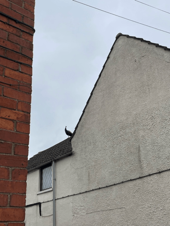 Outside the village store (where we will later buy plum cake and sandwiches for the onward journey) we hear an otherworldly sound… and quickly realise that we’re surrounded by peacocks. We spot them first on a roof, and then they appear down side roads, in gardens, between cars, atop the churchyard hedge. A woman passing by seems amused at our astonished faces…and another stops to talk.